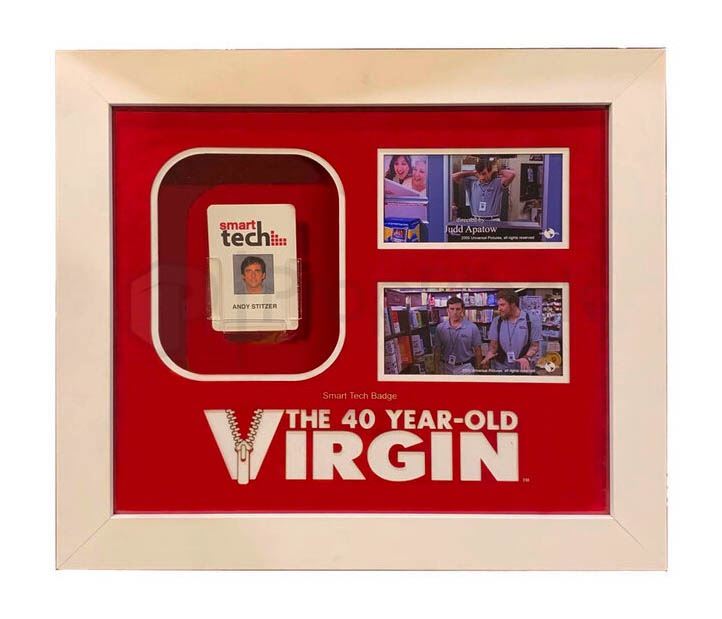 Hero ID used by the character of Andy, actor Steve Carell in the Judd Apatow comedy 40 Year Old Virgin. Goaded by his buddies, a nerdy guy who's never "done the deed" only finds the pressure mounting when he meets a single mother. Andy can be seen wearing this ID throughout the film as he worked at Smart Tech. This piece is made of plastic and features very detailed printed graphics. The item features a custom made display with a matte that has been laser cut with the films logo and images of the prop on screen. This item remains in excellent, production used condition.