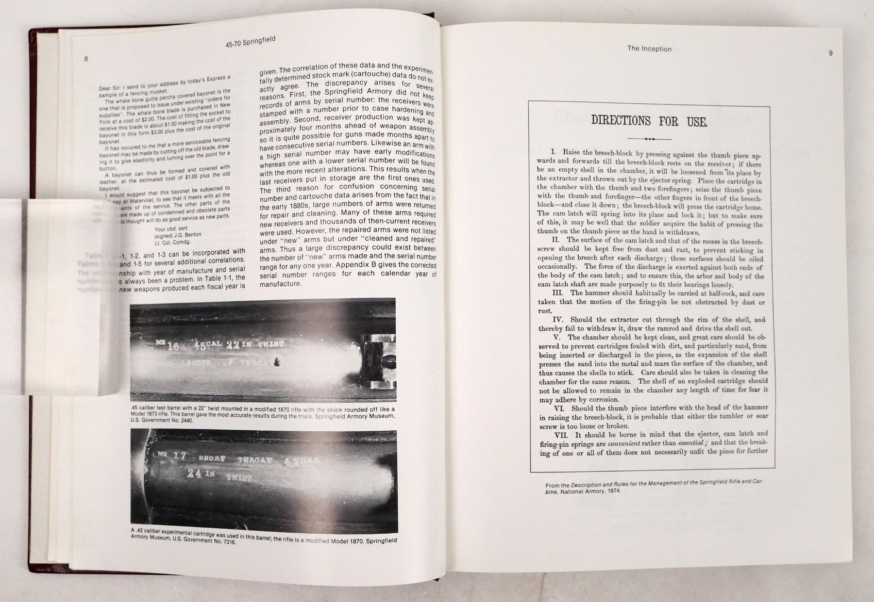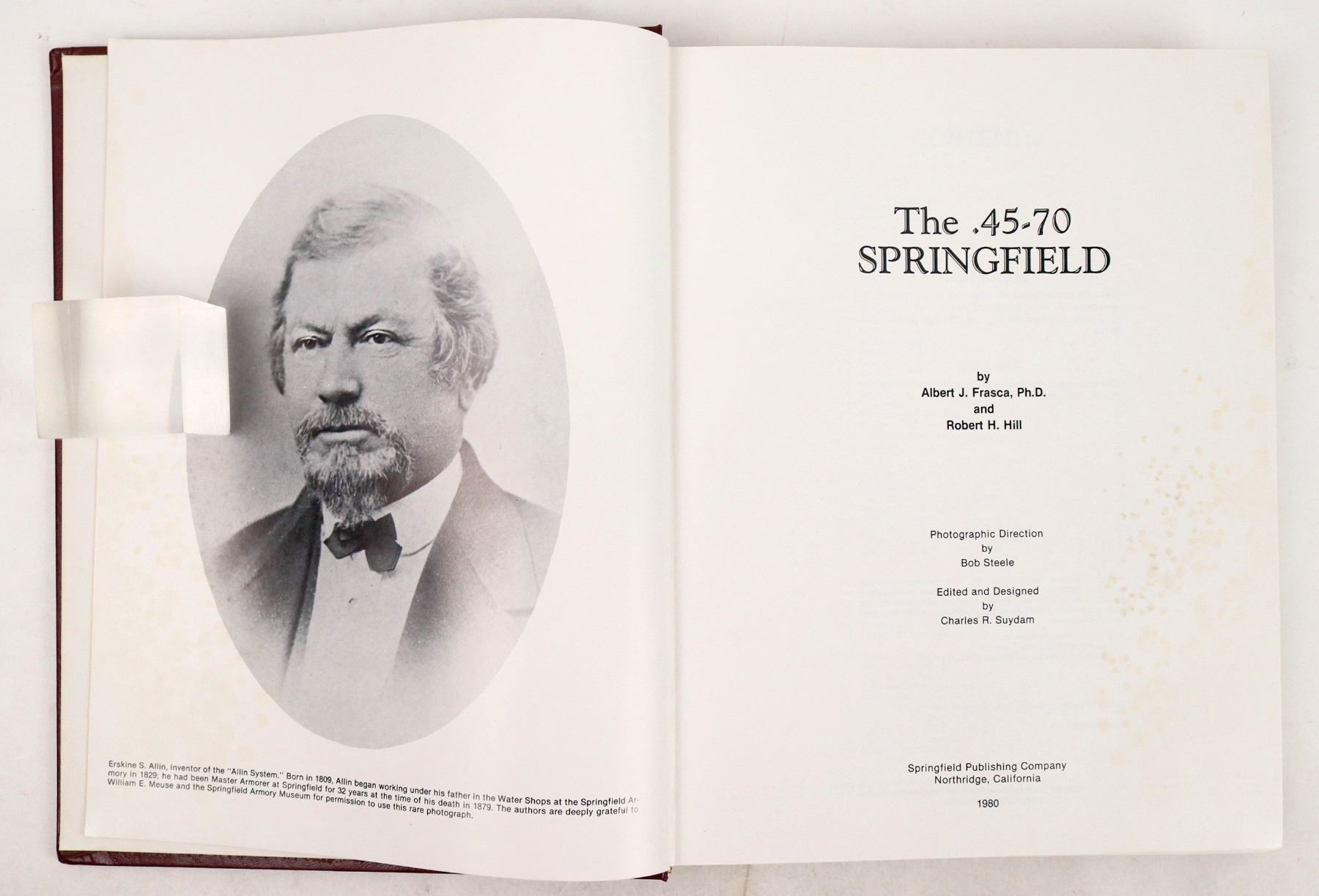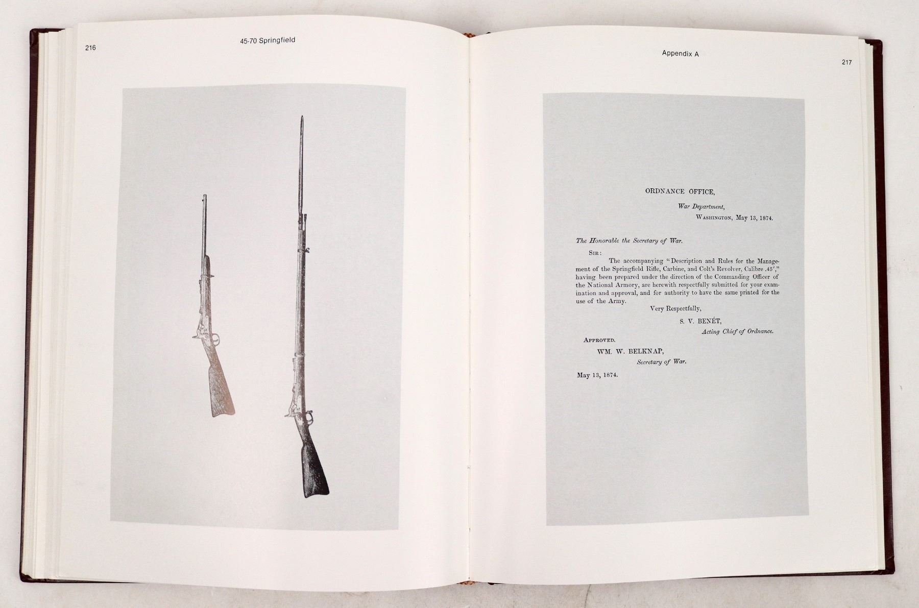 This is the first book in a series on "The .45-70 Springfield" rifle by Albert Frasca, 1980. At pp. 381 it is lavishly illustrated not only for the rifle but all of its accouterments. Slight spotting on the title page, foxed corners in good condition. Stamped original owner inside cover. Red leather cover not DJ. Please see photos for details.