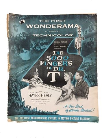 The 5,000 Fingers of Dr. T. (Columbia Pictures,1953). An extremely rare and colorful movie Publicity and Promotional Book. Starring: Peter Lind Hayes and Mary Healy. The book has fold lines, creases, marks, stains, holes, edge wear damage and paper loss. Poor. (14.5" X 17").