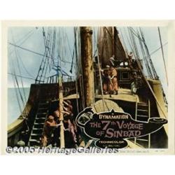 <B>The 7th Voyage of Sinbad (Columbia, 1958)</B></I> Lobby Cards (2) (11" X 14"). The astonishing special effects of the master Ray Harryhausen are featured in this retelling of the adventures of Sinbad. Stop-motion scenes have been shot by other filmmakers, but never to the great effect of Harryhausen's Dynamation. The wonders he produced for this film include a Cyclops, a dragon, a genie in a lamp, a Roc, a shrunken princess in Sinbad's hand and a sword wielding skeleton. His skeleton in this film was just a precursor to the tour de force of an army of skeletons in "Jason and the Argonauts" five years later. One of these cards pictures the dragon emerging from a cave to confront the band of adventurers. The other card is on board Sinbad's ship as the crew raises a giant spear. Very minor flaws in these cards. The ship card has four pinholes and a small smudge in one corner. The dragon card has three pinholes and what appears to be a printing smudge in one corner. Otherwise, these are mint cards. Very Fine/Near Mint. 2 items