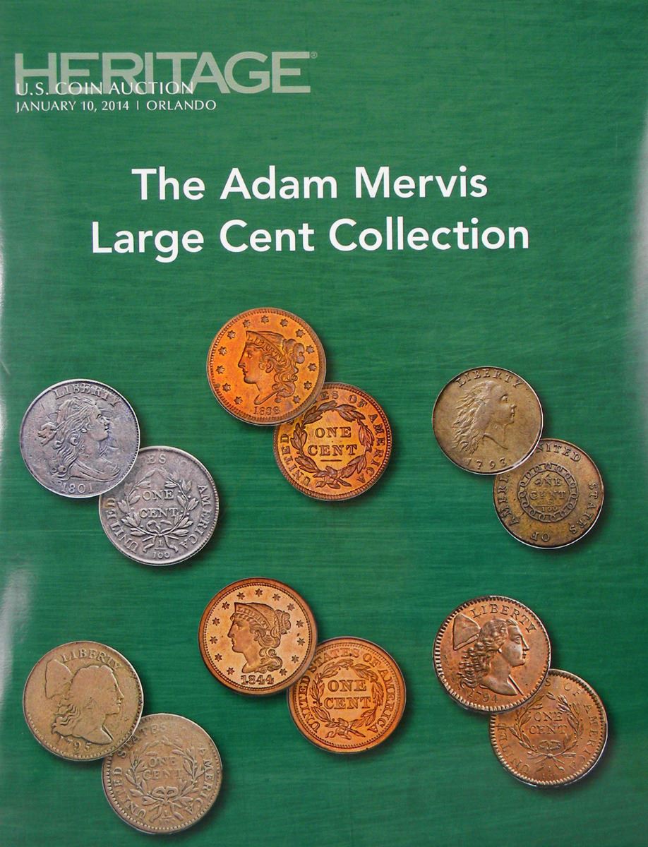 Heritage. THE ADAM MERVIS LARGE CENT COLLECTION. Orlando, Jan. 10, 2014. 4to, original black cloth, gilt; jacket. 256, (8) pages; lots 2001-2880; illustrated throughout in color. Fine. A complete set of U.S. large cents by Sheldon variety is showcased, along with other large cents. The Limited Library Edition.