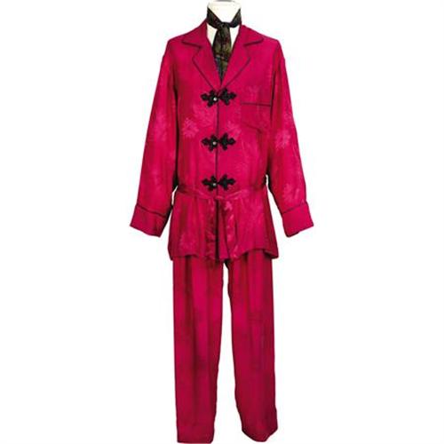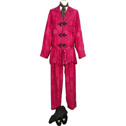 <B>"The Addams Family" Raul Julia Screen-Worn Costume.</B></I> Gomez Addams' two-piece fuchsia silk pajamas with frog-closures, a printed plum ascot made in London, white boxer shorts with a large, printed ant pattern and black velvet slippers with regal appliqués worn by the suave actor Raul Julia as he laid in bed with Morticia in <I>The Addams Family</B></I> (1991). <I>Authenticated by the world's foremost curators of television artifacts, The Comisar Collection of Beverly Hills.</B></I><BR><BR><b>Shipping:</b> Clothing, Costumes & Jerseys (<a target="_blank" href="http://www.heritageauctions.com/common/shipping.php">view shipping information</a>)