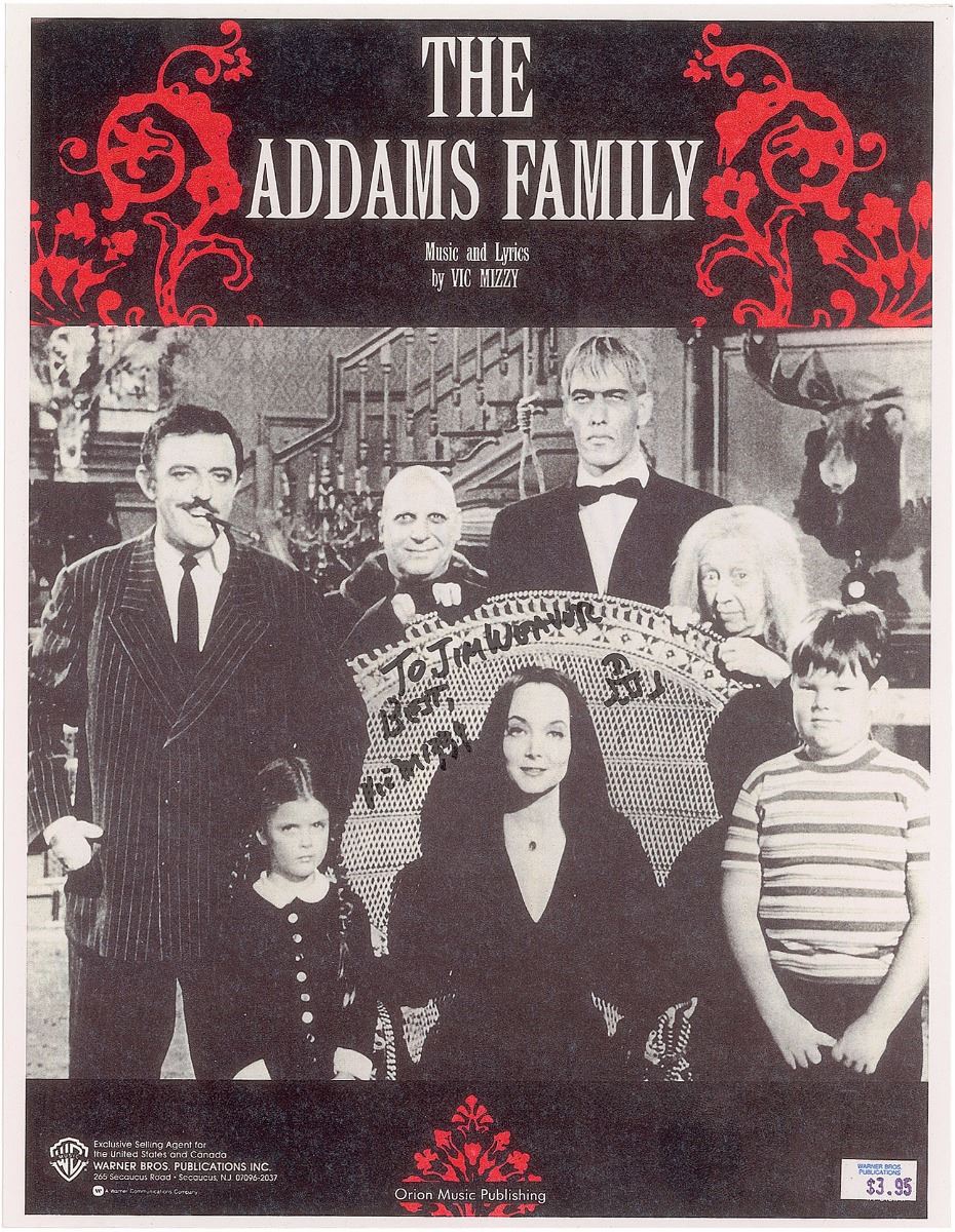 Longtime Hollywood composer (1916-2009) whose best-known works are the themes to the 1960s television sitcoms Green Acres and The Addams Family. Color 8.25 x 11 copy of the sheet music cover for the theme from The Addams Family, signed and inscribed in black felt tip, “To Jim Weaver, Best, Vic Mizzy,” who has signed and inscribed to Weaver again on the reverse, adding three bars of music to the theme song, including the “snap snap” and “da da da dum.” In fine condition, with a trimmed left edge and trivial creasing to corner tips.