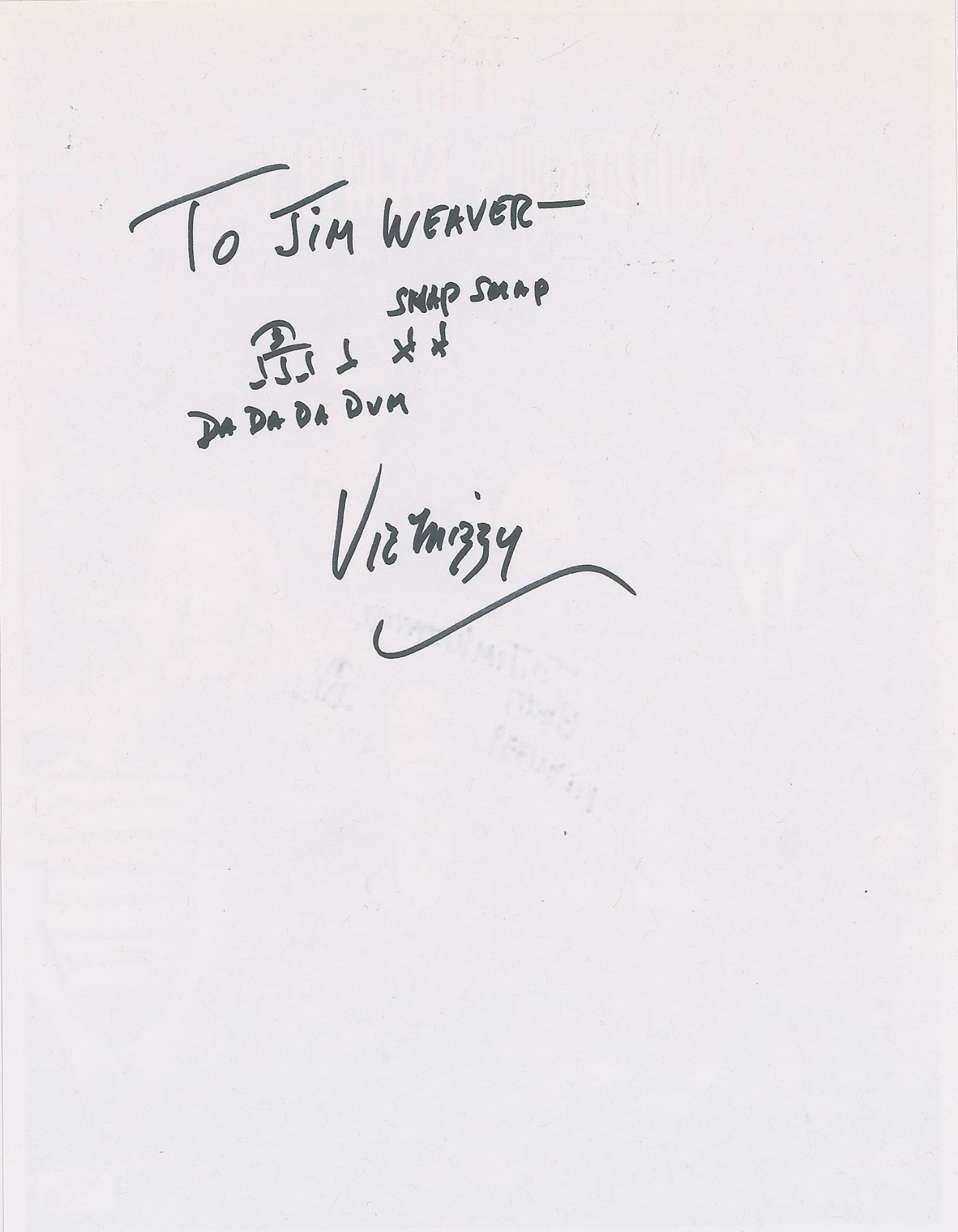 Longtime Hollywood composer (1916–2009) whose best-known works are the themes to the 1960s television sitcoms Green Acres and The Addams Family. Color 8.25 x 11 copy of the sheet music cover for the theme from The Addams Family, signed and inscribed in black felt tip, "To Jim Weaver, Best, Vic Mizzy," who has signed and inscribed to Weaver again on the reverse, adding three bars of music to the theme song, including the "snap snap" and "da da da dum." In fine condition.