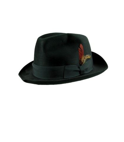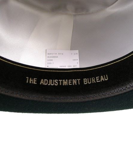Screen worn by a background character, this is a dark brown felt with ribbon and feather around the head 'Biltmore' fedora hat. (Adjustment Bureau on the inside, size 7 3/8)