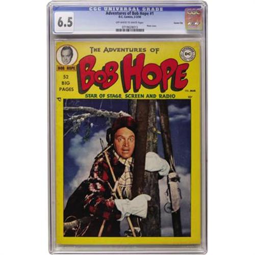 <B>The Adventures of Bob Hope #1 Carson City pedigree (DC, 1950) CGC FN+ 6.5 Off-white to white pages.</B></I> Ol' Ski Nose is <I>on</B></I> skis in this photocover premiere issue. The Gerber "uncommon" issue just doesn't turn up in high grade. CGC's highest certification to date is a FN/VF 7.0, barely nicer than this offering. Overstreet 2007 FN 6.0 value = $567; VF 8.0 value = $1,181. CGC census 5/07: 2 in 6.5, 1 higher.578<BR><BR><b>Shipping:</b> Comics - Slabbed (certified) (<a target="_blank" href="http://www.heritageauctions.com/common/shipping.php">view shipping information</a>)