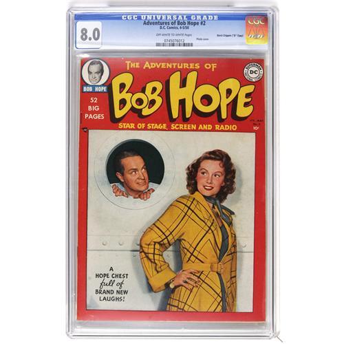 <B>The Adventures of Bob Hope #2 Davis Crippen ("D" Copy) pedigree (DC, 1950) CGC VF 8.0 Off-white to white pages.</B></I> The early issues of this title don't turn up often, and CGC's census bears this out - to date only four copies of #2 have been certified, with only two copies earning more than a FN- 5.5 grade and one copy nicer than this at VF+ 8.5. Overstreet 2006 VF 8.0 value = $506. CGC census 7/06: 1 in 8.0, 1 higher. <I>From the Crippen Collection</B></I>. <BR><BR><B>Important notice:</B> Heritage usually auctions material at the rate of 200-250 lots per hour. On some occasions eBay Live bid software or the Internet may not be able to keep up with the pace of the auction. We recommend placing a realistic absentee bid now as insurance to avoid disappointment. Occasionally the auctioneer may eliminate or reject an eBay Live bid, and the auctioneer may also reopen a lot after the close of the eBay live bidding (usually because we missed an audience bid), and may reject your bid even if it shows you as the winning bidder. By bidding via eBay Live, you agree that Heritage may award the lot to another bidder at its sole discretion under the circumstances described above or any other reasonable circumstances. Since eBay bids are not shown to us until we open the lot on the floor, we treat those bids just like floor bids. In most cases the floor responds before the eBay bid is presented to us, due to Internet lag time, so for consistency we have made it a policy that floor bids are always considered first over tie eBay live bids. Also please note that all Heritage lots purchased through eBay Live carry a 22.5% Buyer's Premium. Please make sure you read the Terms and Conditions before you bid. This lot is being auctioned in conjunction with a live floor auction by Heritage Auction Galleries. All final auction and invoice information will be supplied by Heritage Auction Galleries, and all other information should be considered preliminary. Lot:41001 <BR><BR><B>Winning Notification and Billing:</B> After the FINAL session in this auction is complete, Heritage will send e-mail and snail mail invoices. This process normally takes several days. All final auction and invoice information will be supplied by Heritage Auction Galleries, and all other information should be considered preliminary. <BR><BR>This auction will be conducted on a live auction floor and over the Internet through eBay Live. If you choose to place an absentee bid, please take a moment to <font color='#0000ff'><u><a href='http://pages.ebay.com/liveauctions/help/before/laabsentee.html'>learn how eBay Live absentee bidding works</a></u></font><font color='#000000'>