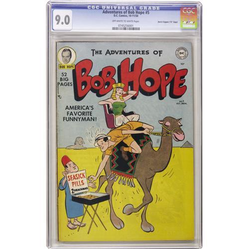 <B>The Adventures of Bob Hope #5 Davis Crippen ("D" Copy) pedigree (DC, 1950) CGC VF/NM 9.0 Off-white to white pages.</B></I> This is the only copy of this book graded above 7.0 by CGC as of this writing. This was the first line-drawn cover of the series for ol' Ski-Nose. Overstreet 2006 VF/NM 9.0 value = $388; NM- 9.2 value = $525. CGC census 9/06: 1 in 9.0, none higher. <I>From the Crippen Collection.</B></I><BR><BR><b>Shipping:</b> Slabbed Comic (<a target="_blank" href="http://www.heritageauctions.com/common/shipping.php">view shipping information</a>)