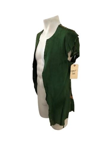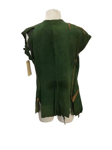 The Adventures of Robin Hood (1938) - Merry Men screen worn, green suede vest with brown leather drawstring detail across the shoulders and down the sides. This definitive adaptation of the British legend was directed by Michael Curtiz and William Keighley, released by Warner Brothers. It was produced on a lavish scale and utilized many extras, including the actor who wore this vest. Includes a backlotprops.com barcode number.
