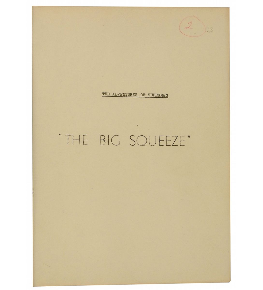 Original unsigned brad-bound script for the Season Two episode of The Adventures of Superman titled ‘The Big Squeeze,’ 9 x 11.5, 50 pages, dated 1953, with the screenplay written by David Chantler. First page bears a synopsis of the episode, with the following page listing the episode’s cast and sets. Script appears to have been used by a crew member, with costume notations next to some of the cast, as well as various camera directions and dialog notations. A vertical pencil line runs through each page as well. In fine condition, with aforementioned notations.