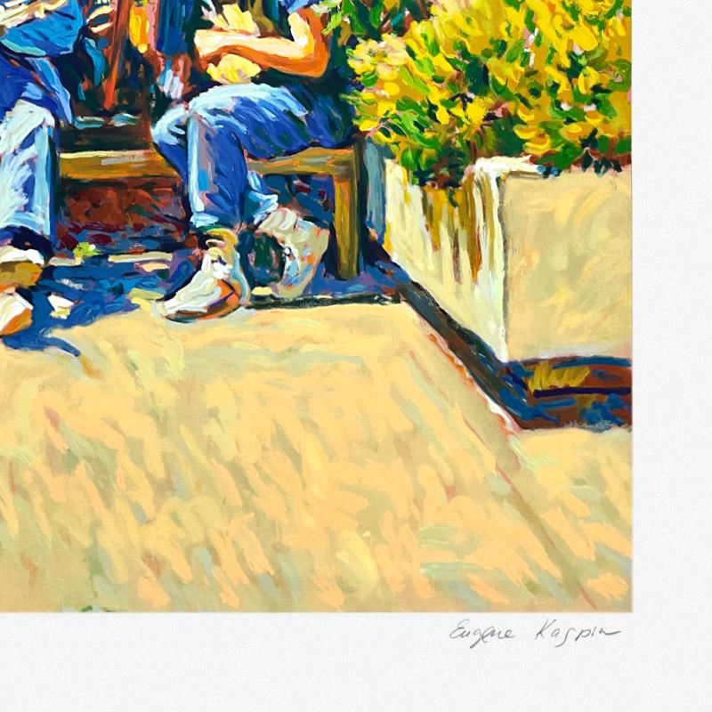 "The Afternoon Jazz" is a limited edition serigraph from a PP Edition on paper by Eugene Kaspin, hand signed by the artist. Includes Letter of Authenticity. Measures approx. 35.5" x 35" (border), 30" x 30" (image). There are minor imperfections in the white border area.