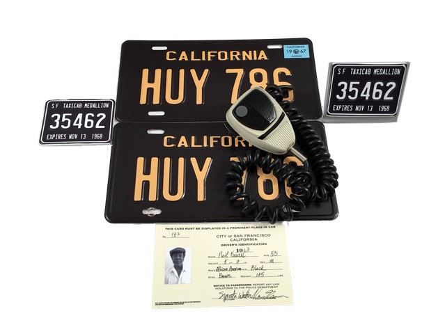 Screen used, hero, thin metal California license plates, two smaller licenses, San Francisco Taxi permit, and radio. (approx. 12" x 6")