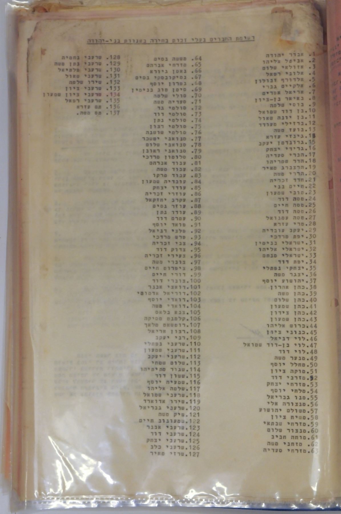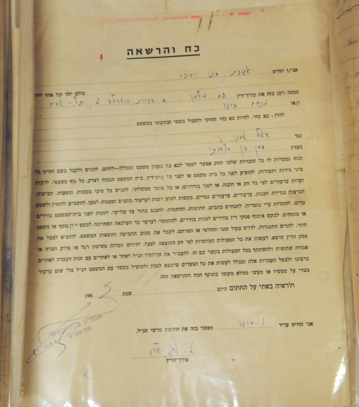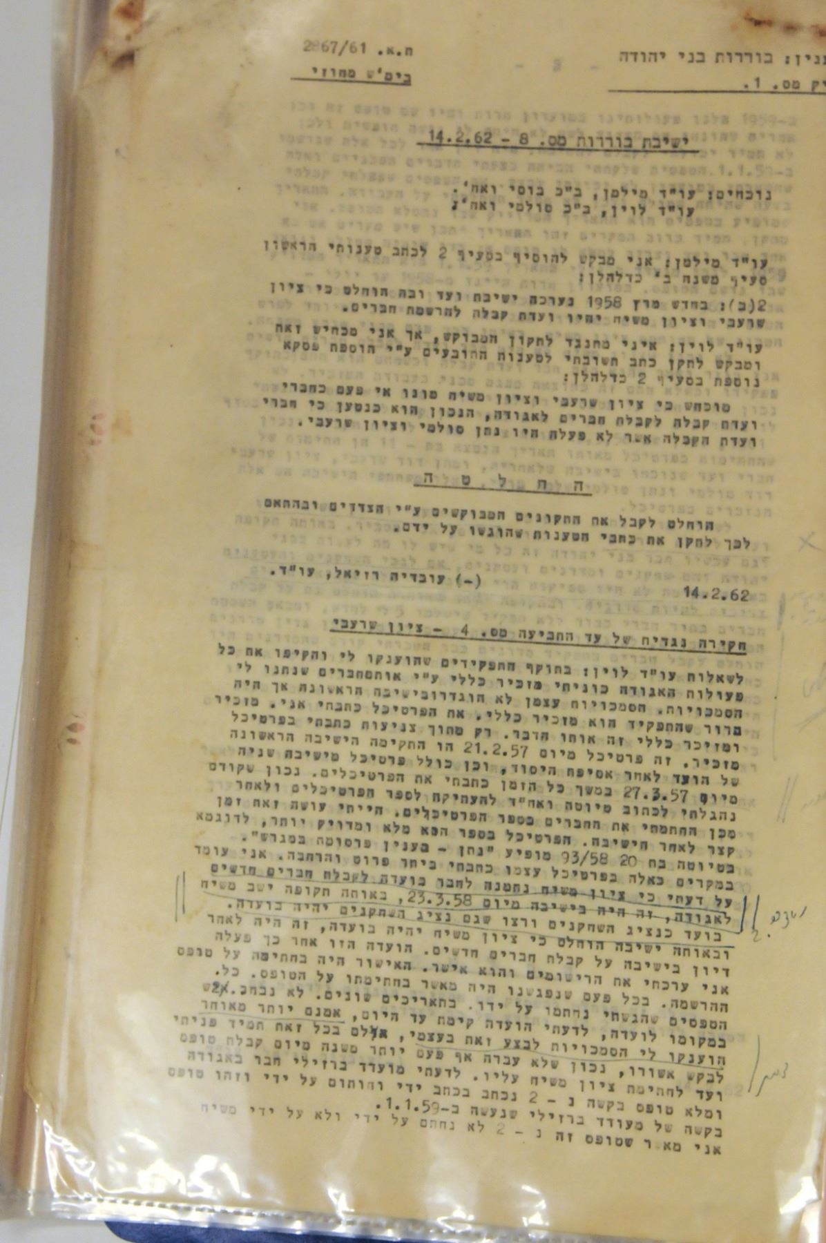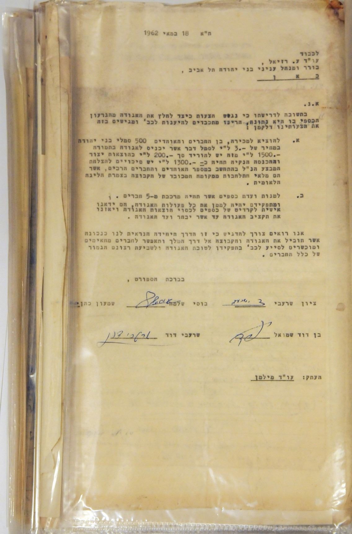 The Agudat Bnei Yehuda football team - collection of documents, letters and official documents of the court related to disputes and arbitration among the team management, early 1960s. The documents include signatures of the group's management: Gad Salomi, Bossi Shlomo, Zion Sharabi and others. Also included is a list of the players and their handwritten signatures.