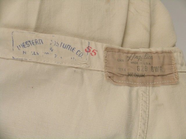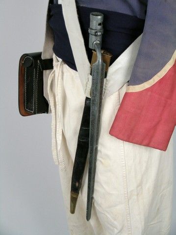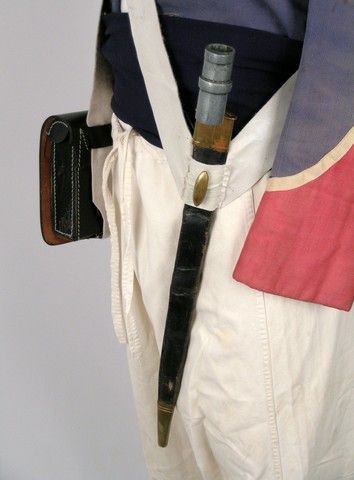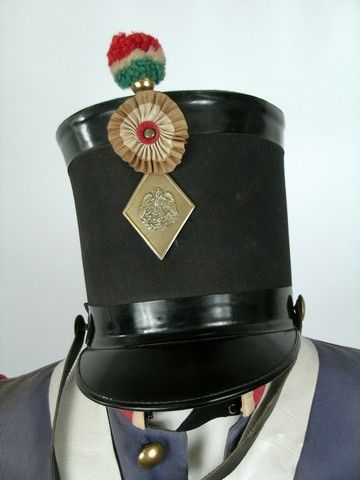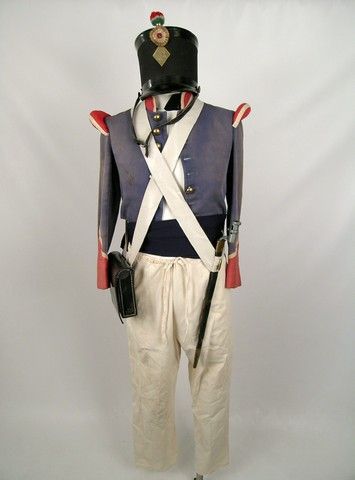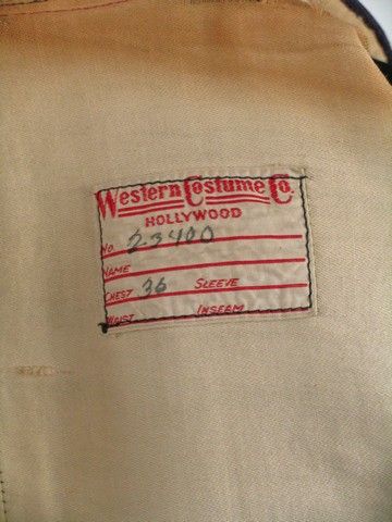 Rare and magnificent. From John Wayne's all-star epic (which he produced, directed and starred in), "The Alamo" (1960), comes this Blue Santa Anna Mexican Army Infantry Costume. Includes a Shako with faded white felt circle, a red-white-blue pompon and diamond eagle/snake crest on front. Authentic tunic with black leather cartridge box and white faux leather strap, white faux leather bayonet scabbard belt and black leather scabbard with pewter bayonet, blue coat with red stand-up collar and shoulder rolls and tan draw string pants. All tunics, pants and shakos are screen-worn although some of the belts and accessories are from the 2004 Disney version of "The Alamo". Comes with all documentation and an official COA. Oversized shipping charges will apply.