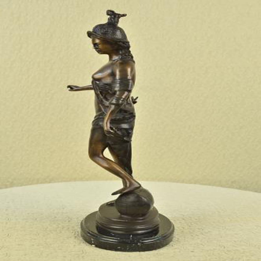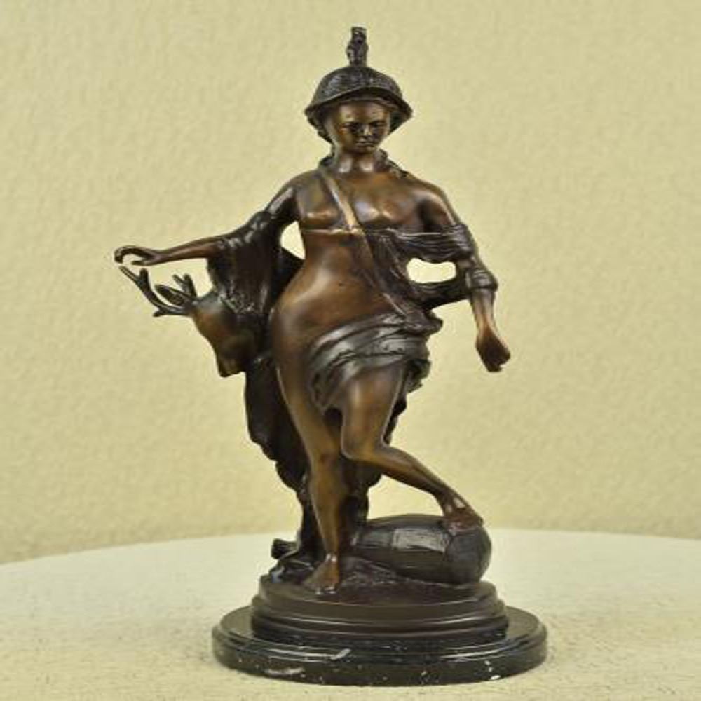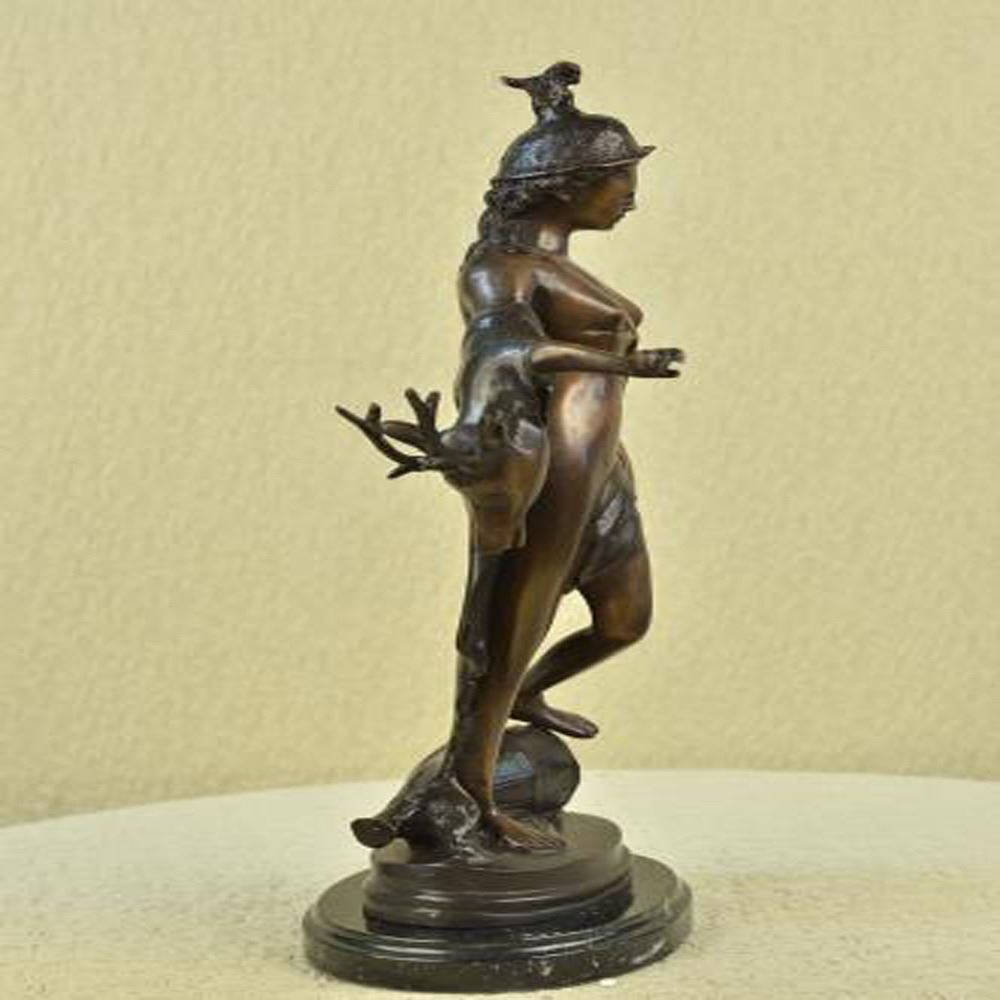 Diana the Hunter, also known as Diana Nemorensis and Artemis. She was worshiped by many as the goddess of hunt, animals, woodland and the moon. In Capua and in Aricia, localities near Rome, there are still shrines dedicated to her. Her shrine in Aricia was on the shores of them lake Nemi. For that reason, she was named Diana Nemorensis Diana of the Woods. The hide of a slayed deer hangs around her nude curves. She places one foot on a barrel and gazes down thoughtfully, as her fingertips graze the deceased game antlers. This brown patina Sculpture was cast using the Lost Wax Method and mounted on a marble base. Bronze Dimensions with Marble Base: Height 19 X Width 8 inches. Weight: 17 LBS.