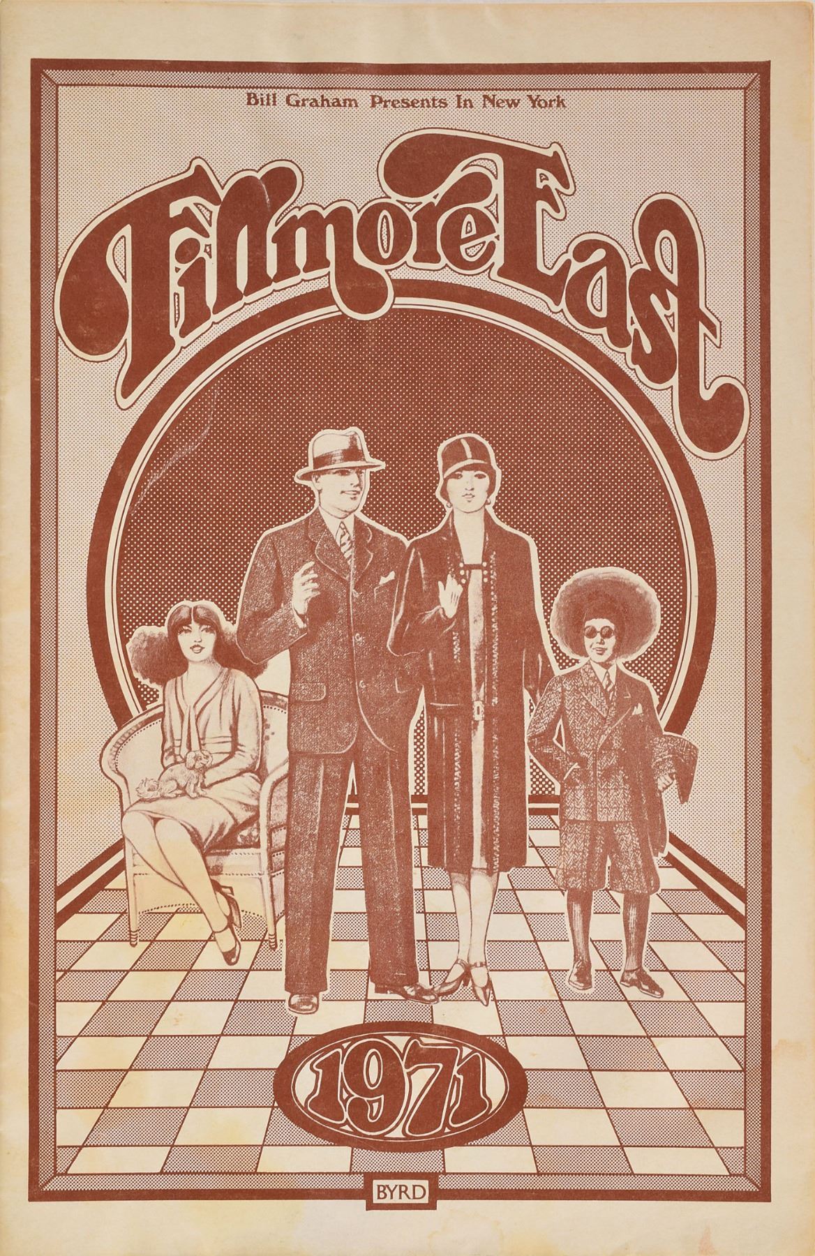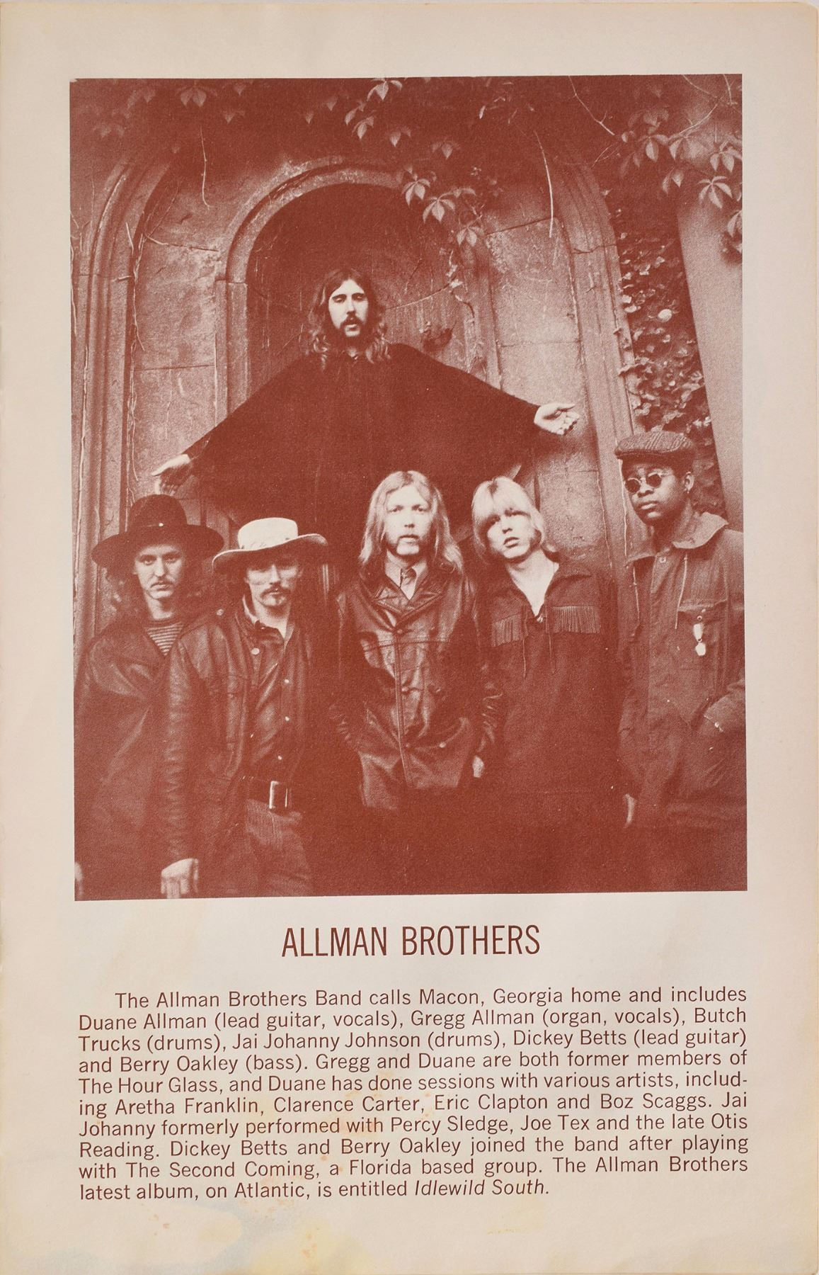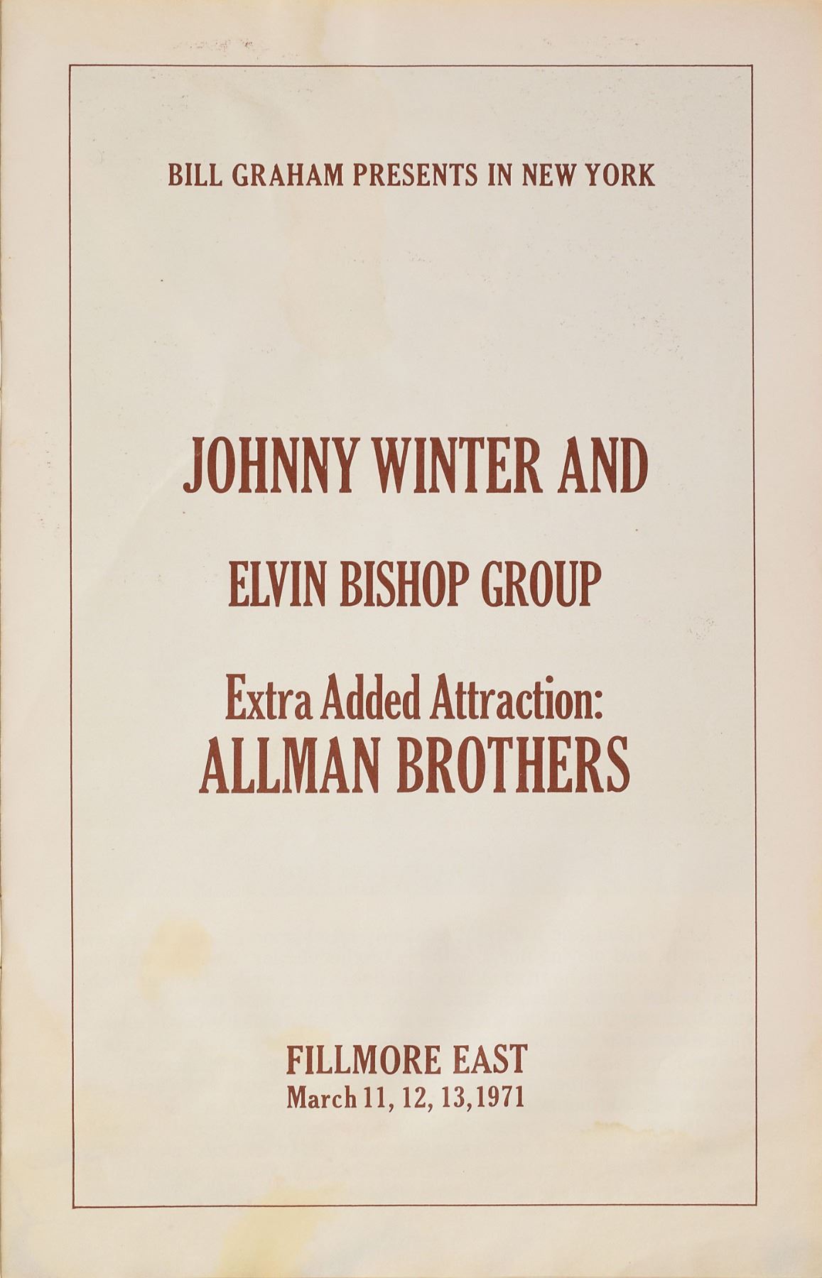 Fillmore East concert program, 5.5 x 8.5, 16 pages, promoting the Johnny Winter and Elvin Bishop Group with "Extra Added Attraction: Allman Brothers" at the classic NYC venue on March 11–13, 1971. The program features short bios and photos of the groups, as well as a variety of classic ads from the period. In very good condition, with scattered creasing and dampstaining. These infamous concerts were recorded for what was to become one of the best live records ever recorded: The Allman Brothers' At Fillmore East, released in July 1971. In 2004, At Fillmore East was selected for preservation in the Library of Congress, deemed to be 'culturally, historically, or aesthetically important' by the National Recording Registry.