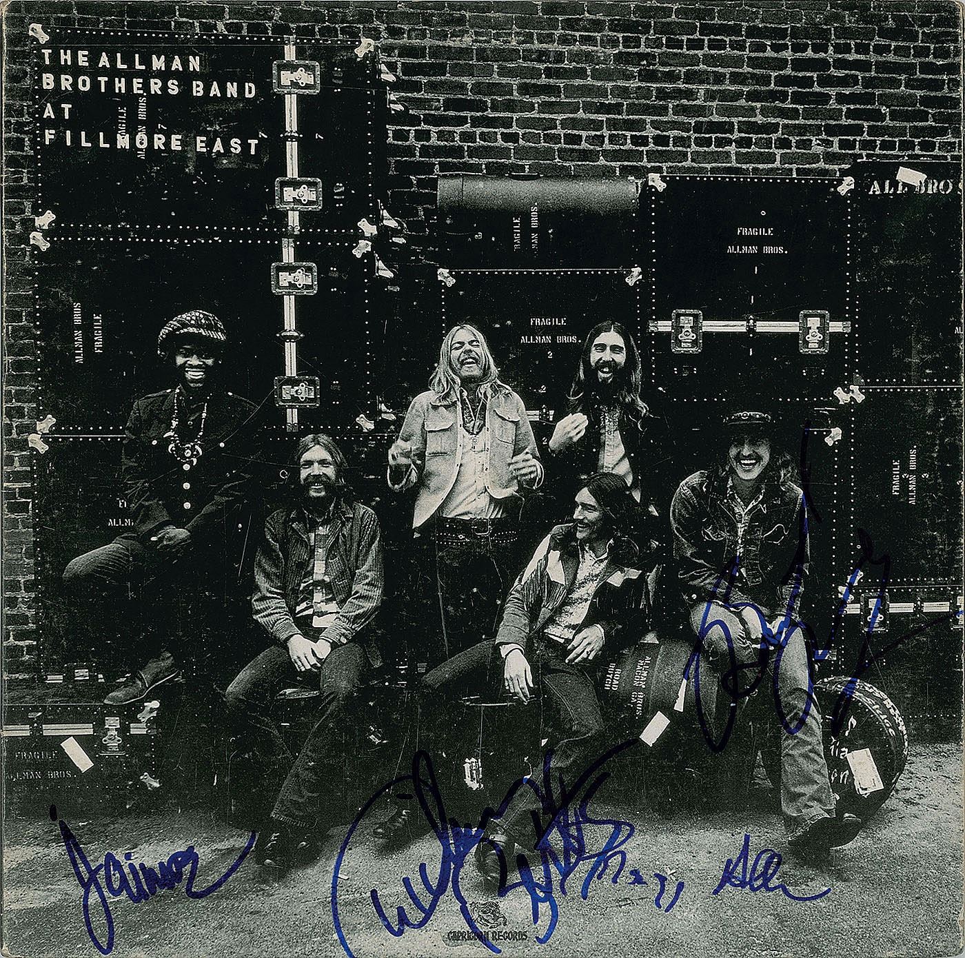 At Fillmore East album signed on the front cover in blue felt tip by Gregg Allman, Jaimoe, Dickey Betts, and Butch Trucks. In fine condition. The record is included. One of the greatest live albums in rock music.