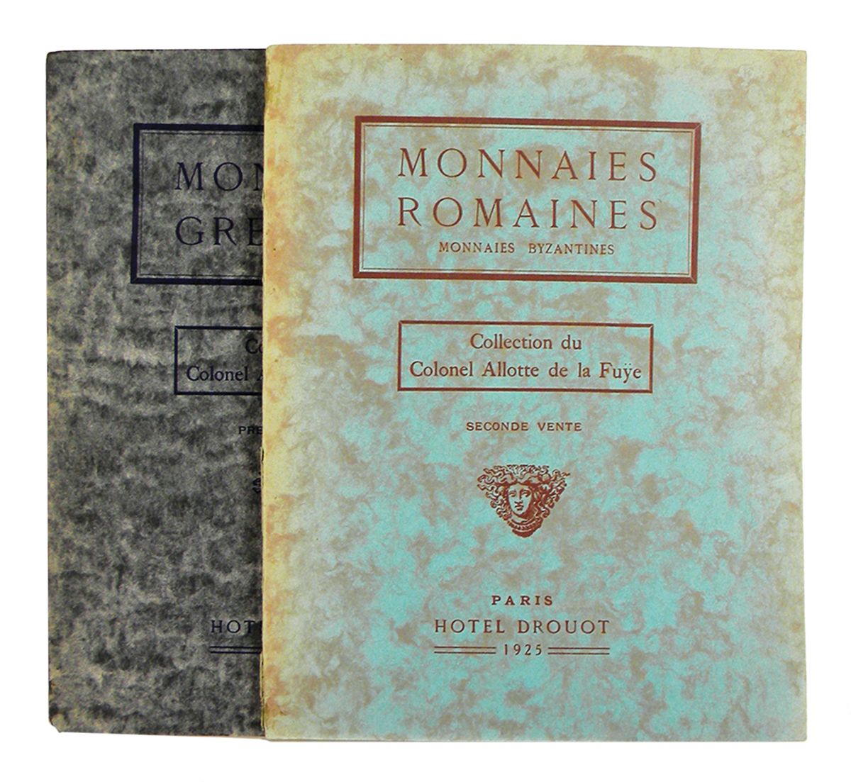 Florange, Jules, and Louis Ciani. MONNAIES GRECQUES. PROVENANT DES COLLECTIONS DU COLONEL ALLOTTE DE LA FUŸE. Paris, 17-21 février 1925. Crown 4to, original printed card covers. 110 pages; 1842 lots; 31 fine plates. Near fine. [with] Florange, Jules, and Louis Ciani. MONNAIES ROMAINES, CONSULAIRES & IMPÈRIALES, MONNAIES BYZANTINES. PROVENANT DES COLLECTIONS DU COLONEL ALLOTTE DE LA FUŸE. DEUXIÈME VENTE. Paris, 28-29 avril 1925. Crown 4to, original printed card covers. 36 pages; 597 lots; 12 fine plates of Roman coins. Light cover and spine wear. Near fine. An important collection. Grierson 279. Spring 185 and 186 (stating that the date of the second sale was changed to 5-6 mai 1925) [first sale listed under Spring's "Most important sales of ancient Greek coins"].