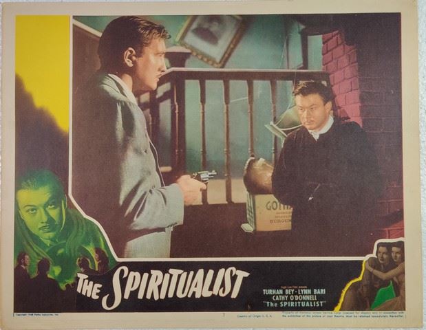 The Amazing Mr. X/The Spiritualist (Benjamin Stoloff, 1948) lobby card. Thriller, Noir. Starring Turhan Bey, Lynn Bari, Cathy O'Donnell, Richard Carlson, Donald Curtis, Virginia Gregg. Directed by Bernard Vorhaus. Very light edge wear, light creases, pin-holes. Excellent. (11"x14").