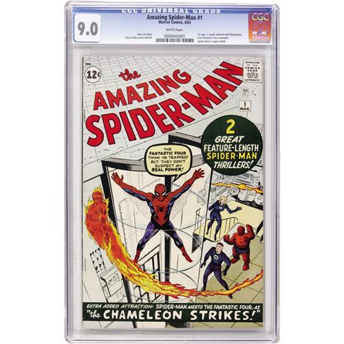 <B>The Amazing Spider-Man #1 (Marvel, 1963) CGC VF/NM 9.0 White pages.</B></I> The "white pages" certification for issue #1 is very hard to come by -- this is only the second time we've ever seen a high-grade copy with this page quality! It's one thing to find this issue in grades up to VF (not that we wouldn't be thrilled to have <I>any</B></I> copy) and quite another to secure one that breaks that VF barrier. If you're looking for a book that will remain in demand for a long time, this should be high on your list, as it's the first issue of comics' most collected title. Making their first appearances here are J. Jonah Jameson, John Jameson, and the Chameleon. Steve Ditko drew the issue's cover (over Jack Kirby layouts). Overstreet 2006 VF/NM 9.0 value = $21,375; NM- 9.2 value = $33,500. CGC census 3/07: 5 in 9.0, 15 higher. <I> From the Janowicz Collection.</B></I><BR><BR><b>Shipping:</b> Comics - Slabbed (certified) (<a target="_blank" href="http://www.heritageauctions.com/common/shipping.php">view shipping information</a>)