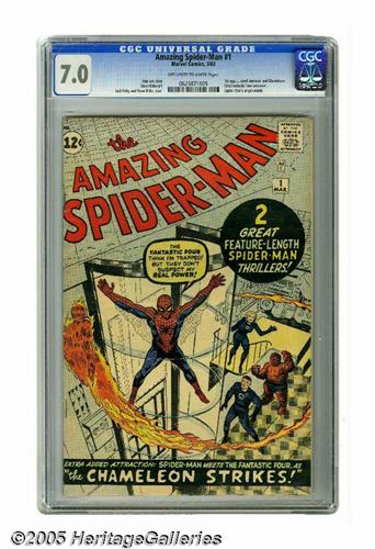 <B>The Amazing Spider-Man #1 (Marvel, 1963) CGC FN/VF 7.0 Off-white to white pages.</B></I> Here's the first issue of what has become the most collected series in comics. Notable first appearances include J. Jonah Jameson, his astronaut son John Jameson (the future Man-Wolf, we might add), and this issue's villain, the Chameleon. Also of note is the Fantastic Four's first appearance outside of their own title -- Spidey tries to join the group but the pay (namely zero) isn't to his liking. There's also a retelling of the Webslinger's origin for everyone who missed <B>Amazing Fantasy</B></I> #15. The cover is a collaboration between Steve Ditko and Jack Kirby, with the interior art all in the hands of Ditko. Overstreet 2005 FN 6.0 value = $2,625; VF 8.0 value = $8,750. CGC census 5/05: 23 in 7.0, 84 higher.