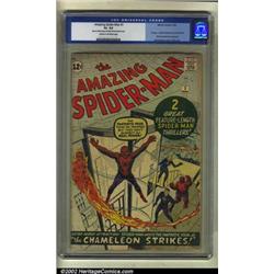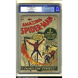 The Amazing Spider-Man #1 (Marvel, 1963) CGC GD+ 2.5 Cream to off-white pages. The Fantastic Four look on in amazement as Spider-Man makes his second appearance in the premiere issue of his own title. Jack Kirby and Steve Ditko worked on this cover together, and Ditko handled all of the interior artwork. Two of Spidey's long time foils -- the Chameleon and J. Jonah Jameson -- make their first appearances here. With the enormous popularity of the movie, this book has nowhere to go but up. Overstreet 2002 GD 2.0 value = $800. Important notice: We expect to be auctioning lots at the rate of 200-250 per hour. Sometimes eBay Premier live bid software cannot keep up with that pace, so we strongly recommend that you place a realistic proxy bid now as insurance to avoid disappointment. Also please note that all Heritage/CAA lots purchased through eBay Premier carry a 20% Buyer's Premium.