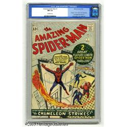 <B>The Amazing Spider-Man #1 (Marvel, 1963) CGC NM 9.4 Off-white pages.</B></I> Spider-Man is not only Marvel's most famous and enduring character, he's the star of two smash hit movies, with more to come. And <B>Amazing Spider-Man</B></I> is currently the most collected series in comics, making demand for this debut issue extremely high. It was only the character's second appearance overall after <B>Amazing Fantasy</B></I> #15. This book is ranked as the fourth most-valuable Silver Age comic book by Overstreet, topped only by the first appearances of the Fantastic Four, the Silver Age Flash, and Spidey himself. The issue also has the first appearance of a key member of Spidey's supporting cast, irascible newspaper publisher J. Jonah Jameson, and also reveals the origin of Jameson's grudge against the Webslinger -- it has to do with Jonah's son, astronaut John Jameson, who also makes his first appearance here and popped up in various storylines in the ensuing years. Lee's winning formula for the character of Spider-Man, plagued by everyday woes like paying the bills, was carried on here in two famous scenes: the first has the hero putting on a performance to make some money only to find out he can't cash a check that's made out to Spider-Man. Then he applies for membership in the Fantastic Four, asking "How much does the job pay? I figure I'm worth your top salary." The quartet of non-profit do-gooders can only shake their heads at that. Spider-Man even finds time to take on his first supervillain, the Chameleon. The story is of course by Lee (who can be forgiven for calling his character "Peter Palmer" in one panel), and the interior art is by Steve Ditko. The cover is billed as a team effort between Ditko and Jack Kirby -- it would appear that Jolly Jack did the layouts, and Sturdy Steve took care of the rest. Since copies of this comic were usually read, re-read, and read again, a 9.4 copy really makes us sit up and take notice. Only four copies of this issue have been certified with higher grades by CGC to date. Overstreet 2004 NM- 9.2 value = $32,000. CGC census 12/04: 5 in 9.4, 4 higher. <I>From the Northern Lights Collection.</B></I>