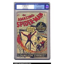 The Amazing Spider-Man #1 (Marvel, 1963) CGC VF+ 8.5 Cream to off-white pages. This is quintessential Spider-Man by co-creator Steve Ditko, the book that kicked off the most popular series of the Silver Age. A nice high-grade example that appears every bit as nice as some of the NM- 9.2 copies we've seen. With no "Marvel chipping" present, a perfect spine, deep colors and a clean back cover, this one should please even the most picky graders. Overstreet 2002 VF 8.0 value = $8,800; NM 9.4 value = $28,000. Important notice: We expect to be auctioning lots at the rate of 200-250 per hour. Sometimes eBay Premier live bid software cannot keep up with that pace, so we strongly recommend that you place a realistic proxy bid now as insurance to avoid disappointment. Also please note that all Heritage/CAA lots purchased through eBay Premier carry a 20% Buyer's Premium. Please make sure you read the Terms and Conditions.