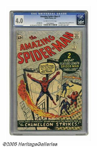<B>The Amazing Spider-Man #1 (Marvel, 1963) CGC VG 4.0 Off-white to white pages.</B></I> First issue copies of <B>Spider-Man</B></I> come through our doors quite often, in all grades. This CGC-certifed Very Good issue looks pretty darn sweet for its grade -- outside of some spine and back-cover wear, it's flat and clean, with good cover color and nice page quality. Spidey's origin is retold here, and the Fantastic Four make their first of many crossover appearances. Also debuting: John Jameson, J. Jonah Jameson, and the Chameleon. Steve Ditko cover (Jack Kirby layout) and art, of course. Overstreet 2005 VG 4.0 value = $1,750. CGC census 7/05: 67 in 4.0, 290 higher.