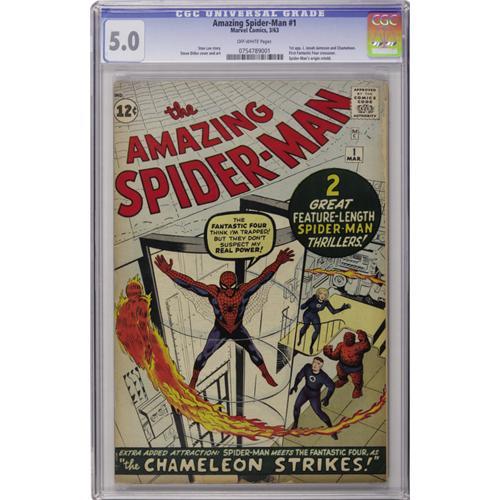 <B>The Amazing Spider-Man #1 (Marvel, 1963) CGC VG/FN 5.0 Off-white pages.</B></I> In this copy from a single-owner collection, Spider-Man's origin is retold, the Fantastic Four appear in their first crossover, and John Jameson, J. Jonah Jameson, and the Chameleon make their first appearances. Steve Ditko supplies the cover and interior art while Jack Kirby furnishes the cover layout. Overstreet 2006 VG 4.0 value = $1,950; FN 6.0 value = $2,925. CGC census 9/06: 61 in 5.0, 474 higher. <I>From the Madison Monk Collection.</B></I><BR><BR><b>Shipping:</b> Slabbed Comic (<a target="_blank" href="http://www.heritageauctions.com/common/shipping.php">view shipping information</a>)
