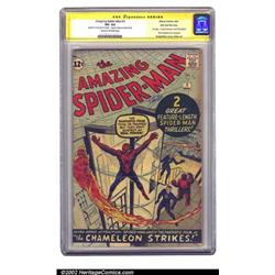 The Amazing Spider-Man #1 Stan Lee File Copy (Marvel, 1963) CGC VG- 3.5 Cream to off-white pages.Signature Series. Probably the most sought-after #1 of the Silver Age, the Web-Head seems to garner more and more fans as years go by. CGC notes, "Signed by Stan Lee on 4/18/02 (2 pieces of tape on interior cover)." Not only do you get a historic comic book, you get a bit of the guy most responsible for bringing the Marvel Universe to us all. The famous cover is by Jack Kirby and Steve Ditko. The issue features the first appearances of J. Jonah Jameson and Chameleon, and the first Fantastic Four crossover. Overstreet 2002 GD 2.0 value = $800; FN 6.0 value = $2,400. Important notice: We expect to be auctioning lots at the rate of 200-250 per hour. Sometimes eBay Premier live bid software cannot keep up with that pace, so we strongly recommend that you place a realistic proxy bid now as insurance to avoid disappointment. Also please note that all Heritage/CAA lots purchased through eBay Premier carry a 20% Buyer's Premium. Please make sure you read the Terms and Conditions.