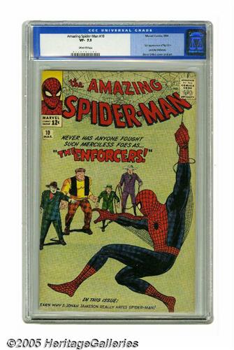 <B>The Amazing Spider-Man #10 (Marvel, 1964) CGC VF- 7.5 Off-white pages.</B></I> This issue marks the first appearance of Big Man and the Enforcers (the Ox, Fancy Dan, and Montana). And when the group picks on Betty Brant and roughs up Peter Parker, it's time for payback, Spidey-style. The issue's interior art is by Steve Ditko, who also did the finished art on the cover over Jack Kirby layouts. Overstreet 2005 VF 8.0 value = $850. CGC census 6/05: 43 in 7.5, 128 higher.