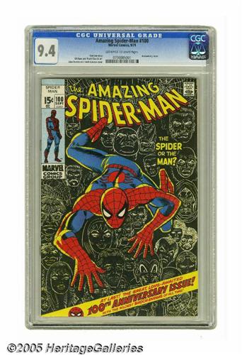<B>The Amazing Spider-Man #100 (Marvel, 1971) CGC NM 9.4 Off-white to white pages.</B></I> Things tended to go from bad to worse for Peter Parker, and it was no different in his 100th outing here. When he tries drinking a potion to rid himself of his spider-powers, he has a horrible dream with the Green Goblin, Vulture, Lizard, Doctor Octopus, and the Kingpin all appearing. And when he wakes up, the reality is worse -- he has six arms! The issue has a John Romita Sr. cover and Gil Kane interior art. Overstreet 2005 NM- 9.2 value = $250. CGC census 1/05: 88 in 9.4, 61 higher.
