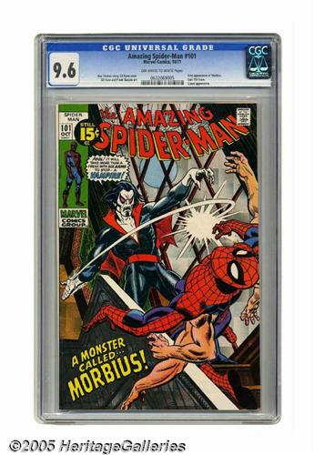 <B>The Amazing Spider-Man #101 (Marvel, 1971) CGC NM+ 9.6 Off-white to white pages.</B></I> This issue has the first appearance of Morbius, which is also the first time a vampire had appeared in a Comics Code-approved comic. As if that weren't enough trouble for Spider-Man, the Lizard also appears. The cover and interior art are by Gil Kane. Overstreet 2005 NM- 9.2 value = $250. CGC census 4/05: 20 in 9.6, 3 higher.