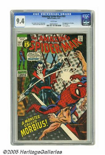 <B>The Amazing Spider-Man #101 (Marvel, 1971) CGC NM 9.4 White pages.</B></I> No sooner did the Comics Code relax its standards to permit vampires than Marvel quickly introduced Morbius in this issue -- he became the first vampire to appear in a Code-approved comic book. Issue #101 also marked the first time that anyone but Stan Lee had scripted this series, luckily the writing chores fell to the eminently capable Roy Thomas. In addition to all of that, there's a Lizard appearance, plus Spider-Man begins the issue with six arms! The cover and art are by Gil Kane. Overstreet 2005 NM- 9.2 value = $250. CGC census 3/05: 18 in 9.4, 23 higher.