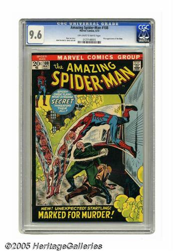<B>The Amazing Spider-Man #108 (Marvel, 1972) CGC NM+ 9.6 Off-white to white pages.</B></I> First appearance of Sha-Shan. John Romita Sr. cover and art. Overstreet 2005 NM- 9.2 value = $60. CGC census 4/05: 13 in 9.6, 4 higher.