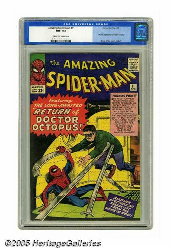 <B>The Amazing Spider-Man #11 (Marvel, 1964) CGC NM- 9.2 Cream to off-white pages.</B></I> This issue, the second appearance of Doctor Octopus, is one for which the Guide values have been far outstripped by high demand, so bring a healthy bidding budget for this 9.2 copy! The cover and the interior art are the work of the great Steve Ditko, and we betcha didn't know that Jack Kirby made a contribution too; the "King" redrew Spidey's legs on the cover. Overstreet 2005 NM- 9.2 value = $1,275. CGC census 5/05: 6 in 9.2, 10 higher.
