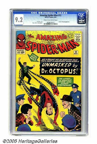<B>The Amazing Spider-Man #12 (Marvel, 1964) CGC NM- 9.2 Cream to off-white pages.</B></I> Comic fans were up in "arms" when they saw this Steve Ditko cover! And what's pictured here really happened in the story, though Stan Lee did provide a senses-shattering <I>twist</B></I>. It's Doc Ock’s third appearance, by the way. Overstreet 2005 NM- 9.2 value = $1,275. CGC census 5/05: 14 in 9.2, 13 higher.