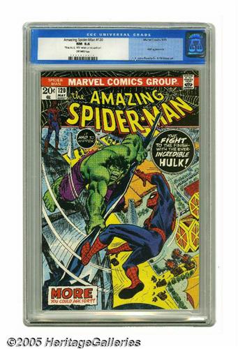 <B>The Amazing Spider-Man #120 (Marvel, 1973) CGC NM 9.4 Off-white pages.</B></I> The Hulk battles Spider-Man in this issue which features the art of John Romita Sr. and Gil Kane. Marvel Bronze Age issues in this condition are hot - get yours now! Overstreet 2005 NM- 9.2 value = $100. CGC census 6/05: 39 in 9.4, 23 higher.
