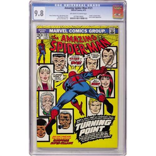 <B>The Amazing Spider-Man #121 (Marvel, 1973) CGC NM/MT 9.8 Off-white to white pages.</B></I> This is as close as you can get to the perfect Bronze Age comic lot. It's got one of the most famous Spidey covers of the 1970s (courtesy of John Romita Sr.) and contains one of the most dramatic events of the decade, the death of Gwen Stacy. This sharp-cornered copy is a dream. Overstreet 2007 NM- 9.2 value = $325. CGC census 6/07: 8 in 9.8, none higher.<BR><BR><b>Shipping:</b> Comics - Slabbed (certified) (<a target="_blank" href="http://www.heritageauctions.com/common/shipping.php">view shipping information</a>)