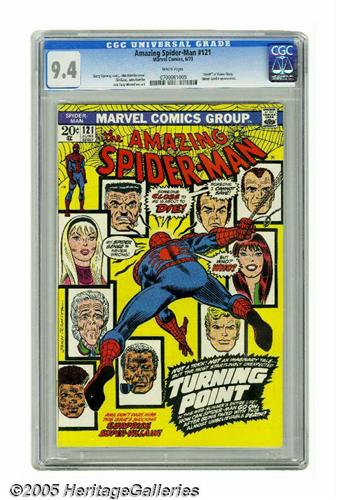 <B>The Amazing Spider-Man #121 (Marvel, 1973) CGC NM 9.4 White pages.</B></I> This issue features the death of Gwen Stacy. The cover art by John Romita Sr. deserves the milestone status that it has attained, and the fantastic interior art by Gil Kane is some of the best of his illustrious career. This copy is a beautiful vehicle for the story, with its brilliant yellow background and near-perfect surface and spine. Overstreet 2005 NM- 9.2 value = $275. CGC census 1/05: 67 in 9.4, 37 higher.