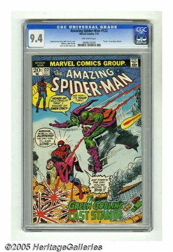 <B>The Amazing Spider-Man #122 (Marvel, 1973) CGC NM 9.4 Off-white pages.</B></I> One of the most collectable Marvels from the '70s follows up Gwen Stacy's death in the preceding issue with the death of the Green Goblin. John Romita Sr. provided the cover, and Romita and Gil Kane provided the interior art. Less than 5% of the copies CGC has certified to date have outgraded this beauty. Overstreet 2005 NM- 9.2 value = $290. CGC census 1/05: 99 in 9.4, 33 higher.