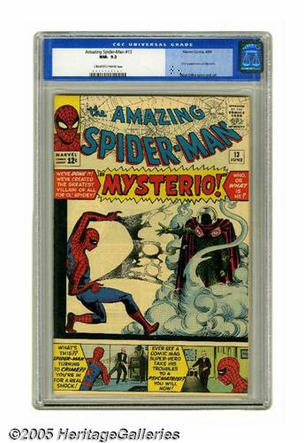 <B>The Amazing Spider-Man #13 (Marvel, 1964) CGC NM- 9.2 Cream to off-white pages.</B></I> Special effects ace turned villain Mysterio made his first appearance in this issue, and he was never more impressive than with Steve Ditko drawing him! Ditko supplied both cover and interior art, and the dialogue's courtesy of Stan Lee. Overstreet 2005 NM- 9.2 value = $1,750. CGC census 5/05: 13 in 9.2, 16 higher.