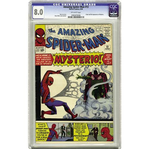 <B>The Amazing Spider-Man #13 (Marvel, 1964) CGC VF 8.0 Off-white pages.</B></I> The whites of this copy look very fresh, and evidently only a few spinal "dings" kept it from a higher grade. The book has the first appearance of Mysterio, written by Stan Lee and drawn by Steve Ditko. Overstreet 2006 VF 8.0 value = $791. CGC census 3/06: 18 in 8.0, 70 higher.