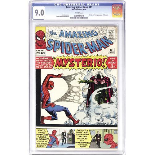 <B>The Amazing Spider-Man #13 (Marvel, 1964) CGC VF/NM 9.0 White pages.</B></I> Note the page quality of this high-grade copy! It's the first appearance of Mysterio, with art by Steve Ditko. <I>Betcha didn't know:</B></I> In the first 15 issues of this title, six different villains were dubbed the greatest/toughest/most dangerous Spidey had ever fought. Overstreet 2006 VF/NM 9.0 value = $1,321; NM- 9.2 value = $1,850. CGC census 5/06: 28 in 9.0, 29 higher. <BR><BR><B>Important notice:</B> Heritage usually auctions material at the rate of 200-250 lots per hour. On some occasions eBay Live bid software or the Internet may not be able to keep up with the pace of the auction. We recommend placing a realistic absentee bid now as insurance to avoid disappointment. Occasionally the auctioneer may eliminate or reject an eBay Live bid, and the auctioneer may also reopen a lot after the close of the eBay live bidding (usually because we missed an audience bid), and may reject your bid even if it shows you as the winning bidder. By bidding via eBay Live, you agree that Heritage may award the lot to another bidder at its sole discretion under the circumstances described above or any other reasonable circumstances. Since eBay bids are not shown to us until we open the lot on the floor, we treat those bids just like floor bids. In most cases the floor responds before the eBay bid is presented to us, due to Internet lag time, so for consistency we have made it a policy that floor bids are always considered first over tie eBay live bids. Also please note that all Heritage lots purchased through eBay Live carry a 22.5% Buyer's Premium. Please make sure you read the Terms and Conditions before you bid. This lot is being auctioned in conjunction with a live floor auction by Heritage Auction Galleries. All final auction and invoice information will be supplied by Heritage Auction Galleries, and all other information should be considered preliminary. Lot:41001 <BR><BR><B>Winning Notification and Billing:</B> After the FINAL session in this auction is complete, Heritage will send e-mail and snail mail invoices. This process normally takes several days. All final auction and invoice information will be supplied by Heritage Auction Galleries, and all other information should be considered preliminary. <BR><BR>This auction will be conducted on a live auction floor and over the Internet through eBay Live. If you choose to place an absentee bid, please take a moment to <font color='#0000ff'><u><a href='http://pages.ebay.com/liveauctions/help/before/laabsentee.html'>learn how eBay Live absentee bidding works</a></u></font><font color='#000000'>