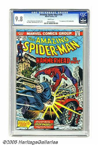 <B>The Amazing Spider-Man #130 (Marvel, 1974) CGC NM/MT 9.8 White pages.</B></I> What a beautiful copy - CGC currently lists just one copy with a higher grade. One of the more controversial Spidey events of the Bronze Age was the introduction of the Spider-Mobile. Spidey and the Human Torch had spent the last couple of issues putting it together, but this is its first appearance as a fully assembled vehicle. Meanwhile, Spider-Man has to deal with Hammerhead, who's being egged on by the Jackal, and things get much worse when Peter Parker finds out that Aunt May is marrying Dr. Octopus (we're not making any of this up). The issue has a John Romita Sr. cover and Ross Andru art. Overstreet 2005 NM- 9.2 value = $45. CGC census 6/05: 7 in 9.8, 1 higher.