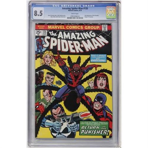 <B>The Amazing Spider-Man #135 (Marvel, 1974) CGC VF+ 8.5 White pages.</B></I> Second full appearance of the Punisher. Origin of the Tarantula. John Romita Sr. cover. Ross Andru art. Overstreet 2007 VF 8.0 value = $53; VF/NM 9.0 value = $82. CGC census 3/08: 40 in 8.5, 238 higher. <I> From the Furfferi Collection.</B></I><BR><BR><b>Shipping:</b> Comics - Slabbed (certified) (<a target="_blank" href="http://www.heritageauctions.com/common/shipping.php">view shipping information</a>)