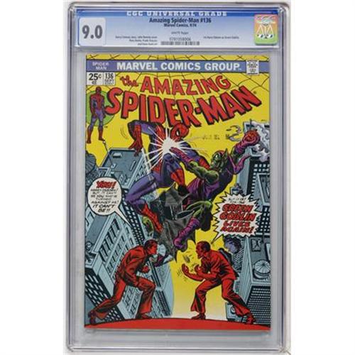 <B>The Amazing Spider-Man #136 (Marvel, 1974) CGC VF/NM 9.0 White pages.</B></I> Green Goblin cover and story. Second Harry Osborn Goblin. John Romita Sr. cover. Ross Andru art. Overstreet 2007 VF/NM 9.0 value = $78; NM- 9.2 value = $105. CGC census 3/08: 62 in 9.0, 243 higher. <I> From the Furfferi Collection.</B></I><BR><BR><b>Shipping:</b> Comics - Slabbed (certified) (<a target="_blank" href="http://www.heritageauctions.com/common/shipping.php">view shipping information</a>)