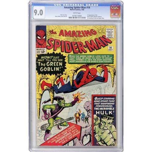 <B>The Amazing Spider-Man #14 (Marvel, 1964) CGC VF/NM 9.0 White pages.</B></I> The first appearance of the Green Goblin is the most valuable issue of this series with the exception of #1-5, and likely to remain so given the popularity of this bad guy! The cover (note Gobby's clunky original glider!) is by Steve Ditko. Overstreet 2006 VF/NM 9.0 value = $2,481; NM- 9.2 value = $3,500. CGC census 3/07: 44 in 9.0, 56 higher.<BR><BR><b>Shipping:</b> Comics - Slabbed (certified) (<a target="_blank" href="http://www.heritageauctions.com/common/shipping.php">view shipping information</a>)