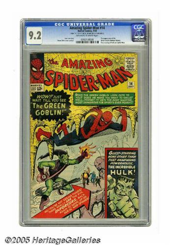 <B>The Amazing Spider-Man #14 (Marvel, 1964) CGC NM- 9.2 Off-white to white pages.</B></I> Here's the first appearance of the Green Goblin (Norman Osborn), as well as a crossover by "that rampaging powerhouse," the Incredible Hulk. This Silver Age key issue has a great cover and interior artwork by Steve Ditko. This is a sweet copy, with great cover gloss and excellent paper quality. CGC notes: "From the collection of Joe and Nadia Mannarino." Overstreet 2005 NM- 9.2 value = $3,500. CGC census 6/05: 28 in 9.2, 26 higher.